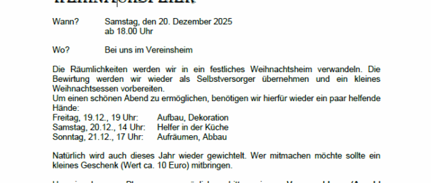 Weihnachtsfeier am 20.12.2025 Veröffentlicht am 1. November 2025 von Klaus // 0 Kommentare Tweet Und schon neigt sich auch das ereignisreiche Jahr 2025 bereits wieder langsam seinem Ende entgegen und wir möchten der Tradition folgend alle recht herzlich einladen zu einer gemeinsamen Weihnachtsfeier ein. Weihnachtsfeier 2025