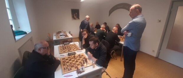 Danach folgten 2 sichere Remisen an den Brettern 5 (Christian Jendel) und 6 (Michael Tönnies), so dass es zur „Halbzeit“ 3-1 stand. Ein weiteres Remis steuerte Captain Marcel Liebhart bei, der allerdings einen Schreckmoment überstehen musste. Zum Glück befiel sein Gegner die gleiche, kurzzeitige Schachblindheit, so dass Marcel keinen Bauern verlor. Aber trotz der 2 Punkte Führung blieb es weiterhin spannend. Dem Albstädter Ersatzmann Artur Hovhannisyan saß ein starker und erfahrener „Ersatzspieler“ gegenüber. Allerdings spielte Artur stark und konnte die Partie immer im Gleichgewicht halten bzw. hatte eher Chancen auf mehr. Da es an den anderen beiden Brettern für die Albstädter jeweils mindestens nach Remis aussah, wickelte Artur in ein ausgeglichenes Turmendspiel ab und einigte sich mit seinem Gegenüber auf die Punkteteilung.